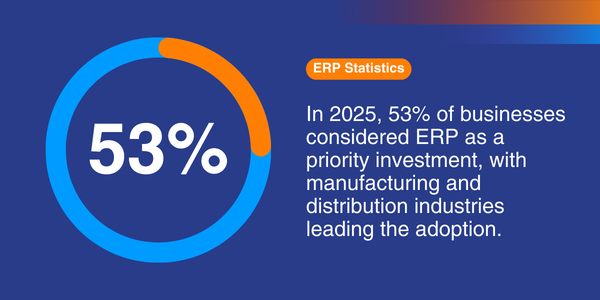 - In 2025, 53% of businesses considered ERP as a priority investment, with manufacturing and distribution industries leading the adoption.