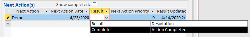 Most contact management systems provide tools that allow you to set-up next action dates. This is useful for moving sales prospects through your sales funnel. You can track what steps they have already completed, what needs to happen next and when, and who is responsible. Sophisticated systems can automatically populate certain fields based on specific changes. Let’s look at an example. Let’s say you choose Demo from a list of actions under the column header Next Action. You then set a date for this Demo in the Next Action Date column. Then, once you have finished the demo on the set date, you choose Complete from a list of drop-down options under the column Result. By choosing Complete as the Result, the system will now automatically set a new Next Action item and associated Next Action Date such as Send Pricing Information set for 3 days after the Demo is marked as complete.